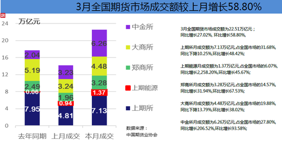 中国期货业协会最新统计资料表明,3月全国期货市场交易规模较上月有所上升,以单边计算,当月全国期货市场成交量为299,335,769手,成交额为225,145.56亿元,同比分别增长5.30%和27.02%,环比分别增长51.36%和58.80%。1-3月全国期货市场累计成交量为769,885,682手,累计成交额为560,808.44亿元,同比分别增长25.43%和36.45%。